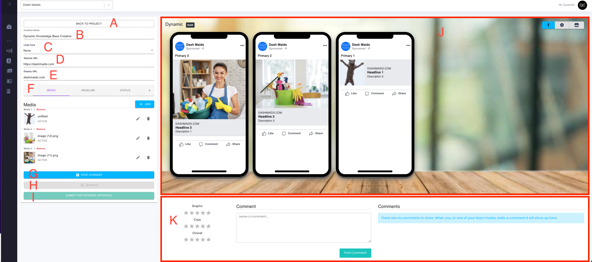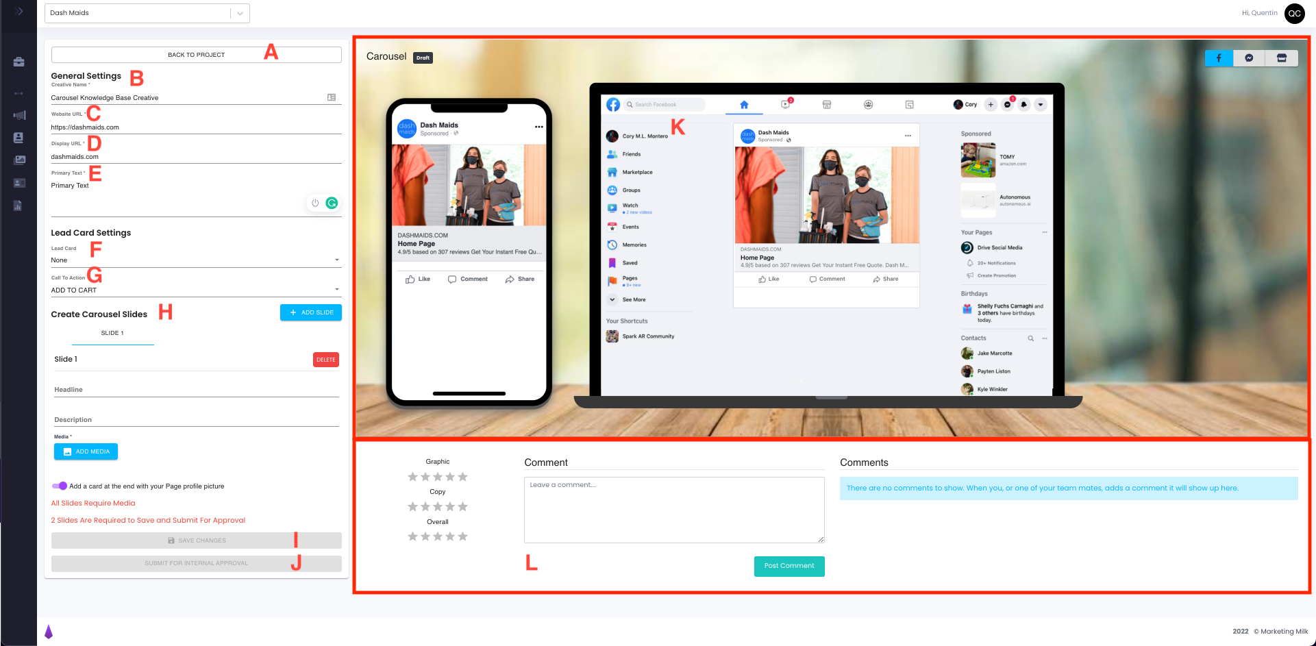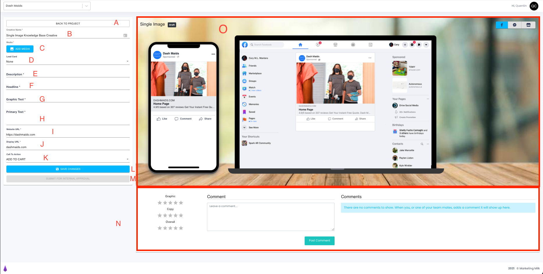 L. Comment Section - This is where a user can rate the creative. They will be able to add a comment to the creative, and they will be able to view any comments that were left on the creative
