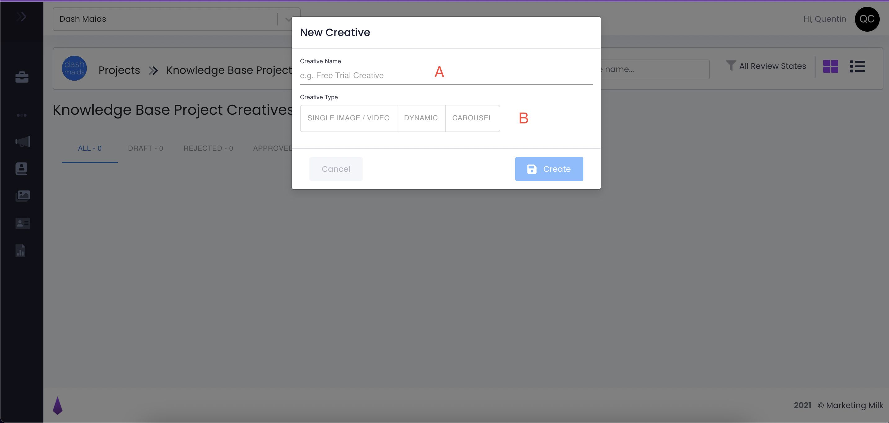 B. Creative Name (Required) - This will be where the user will name their creative. (This should auto-populate with the creative name you put in the model that you saw before this screen.)