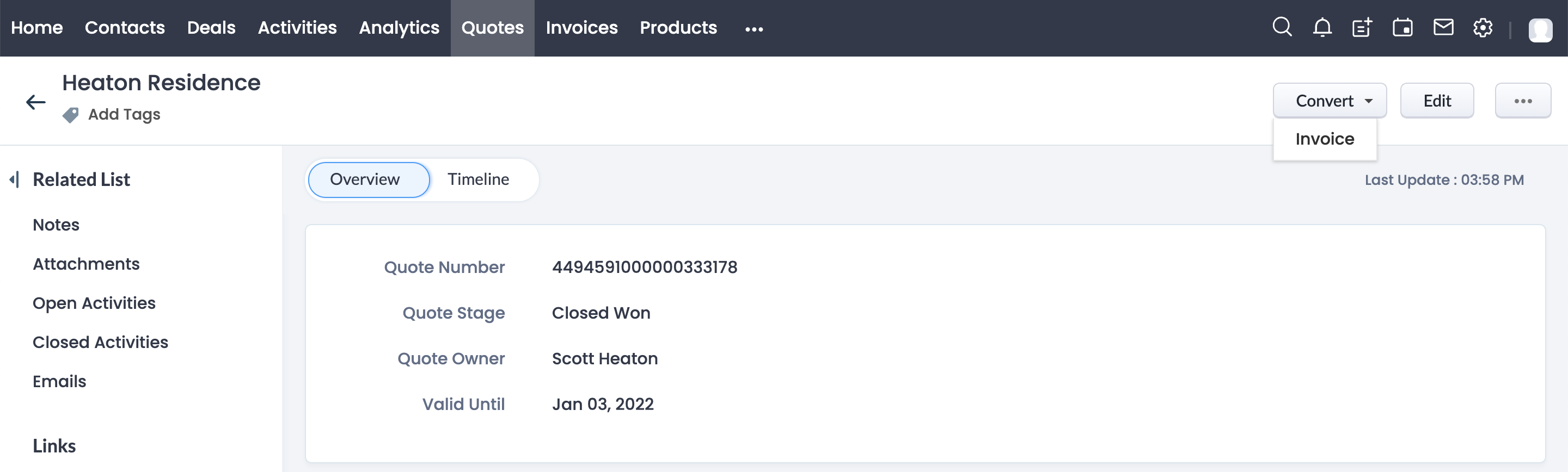 Great news! Your quote was accepted by a lead. Now, it's time to send an invoice. All you have to do is go to the Contact, click on the Quote, then click "Convert" in the top right corner. Next, click Invoice.
