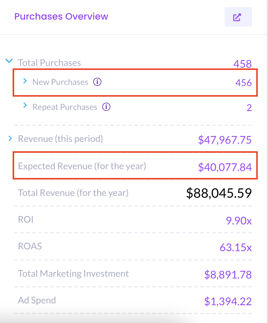 If your Yearly Value of a Customer and your First Initial Purchase amount are set correctly, and you feel that your expected revenue still doesn't match, check to see if your number of new purchases is different than expected. This can be caused by Data Extrapolation.